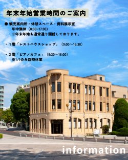 広島市平和記念公園レストハウスにご来館いただきありがとうございます。 レストハウスは年末年始も通常通り営業いたします。 開館時間 8:30~17:00 2階「ピアノカフェ」...